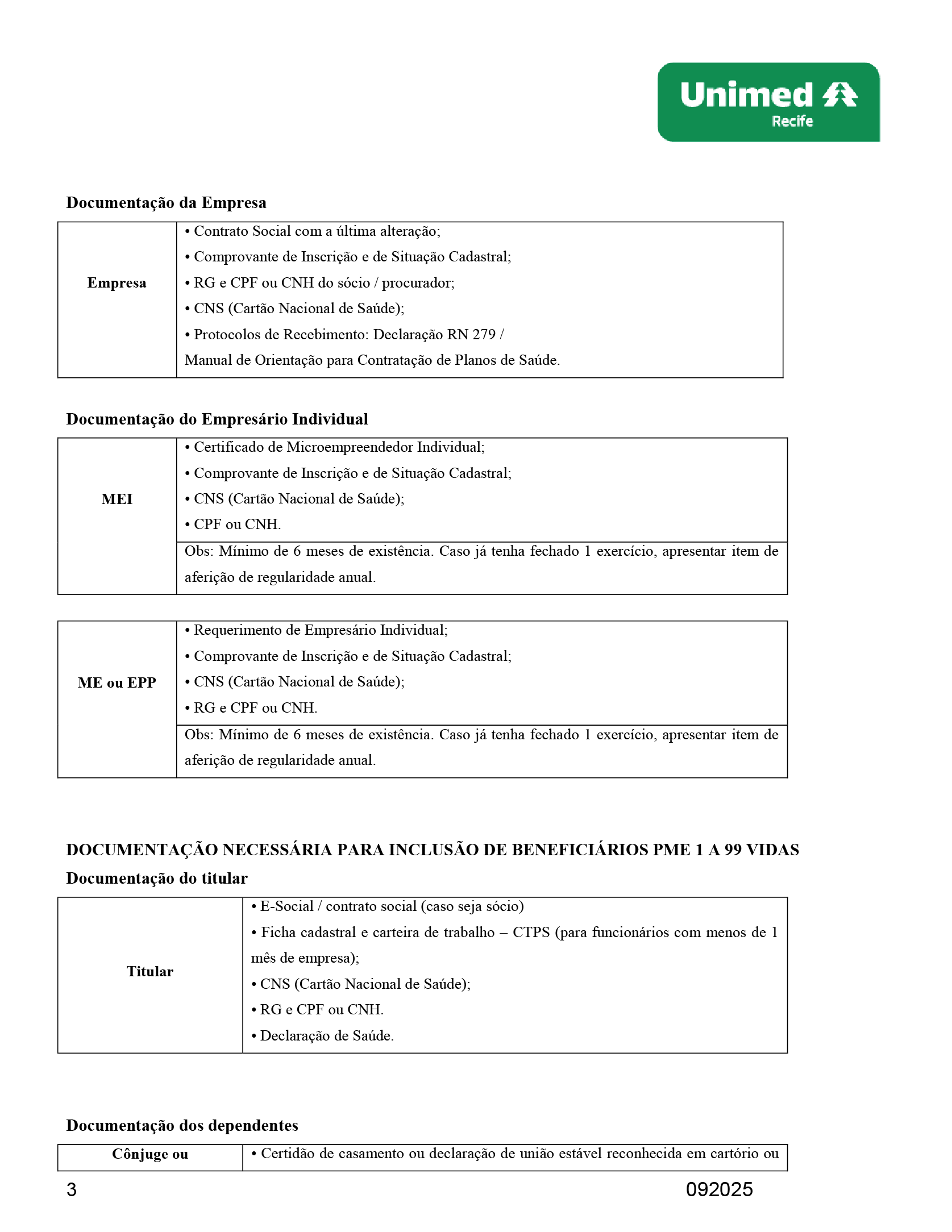 Documentação Necessária para inclusão de beneficiários do Plano de Saúde PME (até 99 vidas).