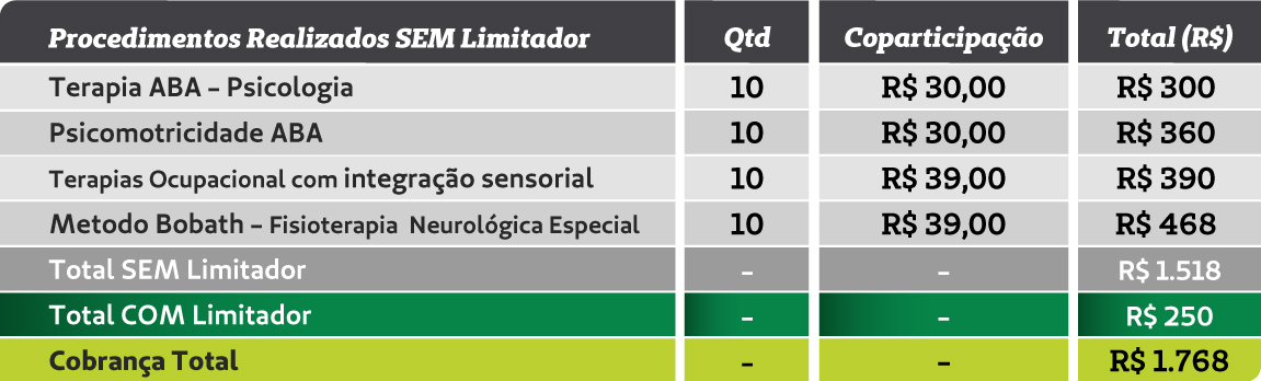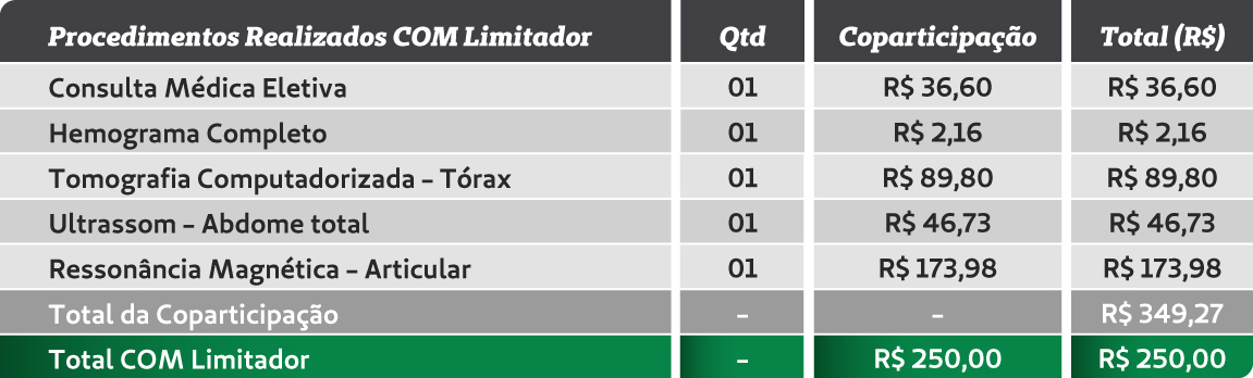 ² Valor máximo a ser cobrado, conforme tabela de coparticipação. Se a soma dos valores coparticipados no mês for menor que o limitador mensal, prevalece a soma dos procedimentos.