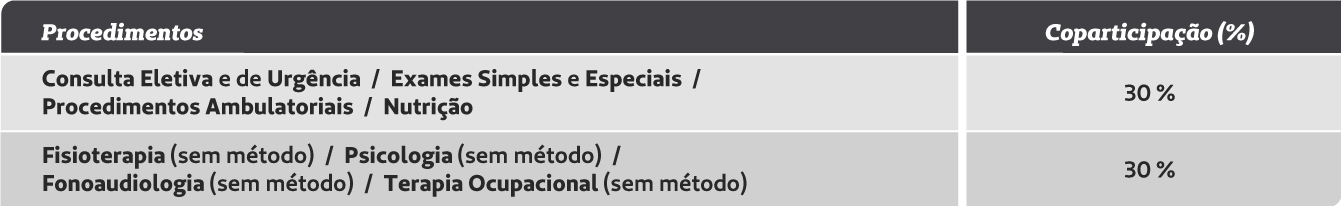 * Haverá cobrança de coparticipação de 30% para as sessões/avaliações/ consultas com métodos de Profissionais da área de Saúde ( Fonoaudiólogos, Psicólogos , Fisioterapeuta e Terapia Ocupacional) e diária de internação psiquiátrica* à partir do 31º dia sem limitador mensal de cobrança.