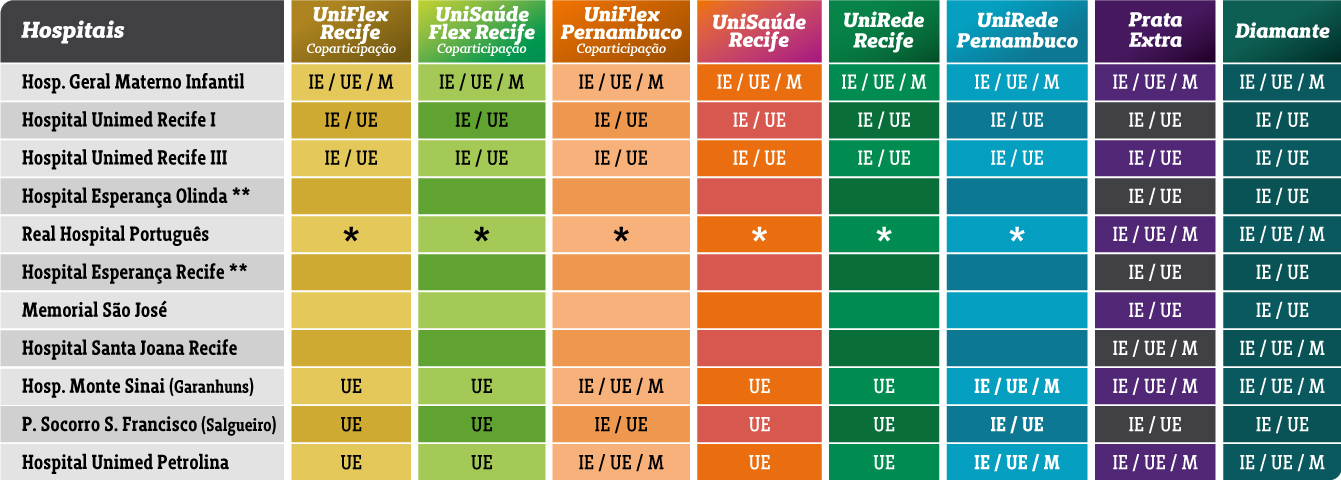 * Real Hospital Português para os planos UniRede Recife (Enfermaria e Apartamento), UniFlex Recife com Coparticipação (Enfermaria e Apartamento), UniRede Pernambuco (Enfermaria e Apartamento), UniFlex Pernambuco com Coparticipação (Enfermaria e Apartamento), UniSaúde Recife (Enfermaria e Apartamento), UniSaúde Flex Recife com Coparticipação (Enfermaria e Apartamento) apenas cirurgia cardíaca pediátrica. ** Exceto atendimento na especialidade Pediatria nos Hospitais Esperança Olinda e Esperança Recife.